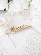 Features gold-tone, Claris pearl embellished logo lettering, clip-on design. easily slides and secures into hair.