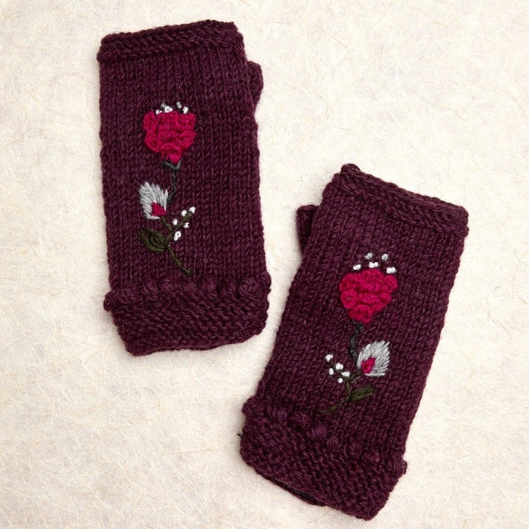 Meet the Therese Deep Plum Handwarmers, a refined layer of warmth and ease. Hand-knit in rich plum and embroidered with delicate florals in soft berry and gray tones —perfect for staying cozy while keeping your fingers free. With subtle texture and fleece lining, they bring handcrafted elegance to everyday winter moments.