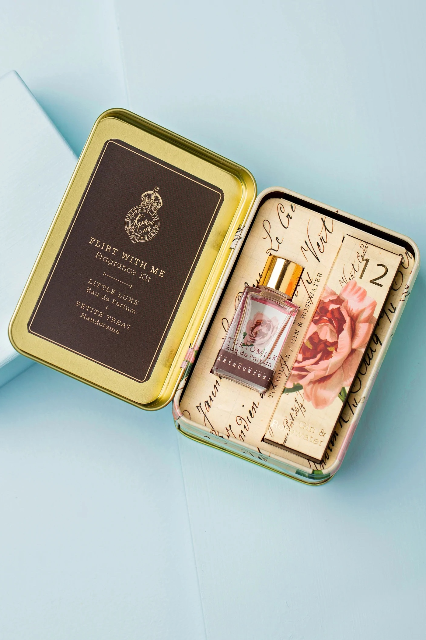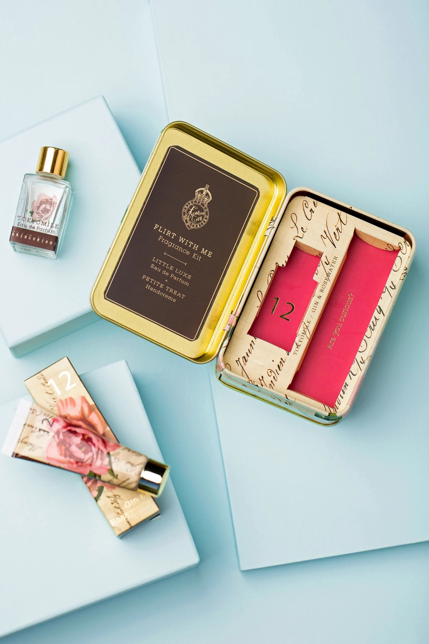 Adorned with watercolor roses, this tin box opens to reveal a romantic artful interior and an enchanting duo of treasures: the Little Lux Eau de Parfum and Petite Treat handcreme.