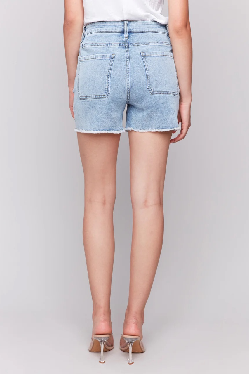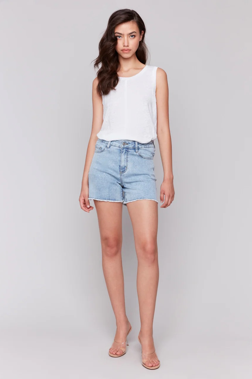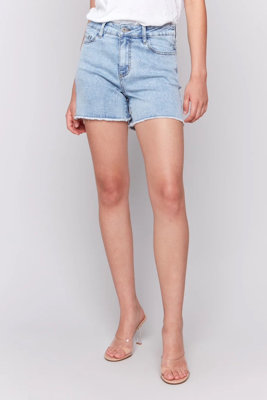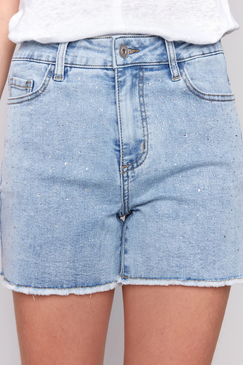 Shine under the summer sun with our stunning light blue denim shorts adorned with an all-over rhinestones. Merging comfort and style, they're perfect for casual outings or relaxed days at home. Featuring a frayed hem and a regular rise, these jean shorts are versatile and easy to pair with any top. They are an essential addition to your spring & summer wardrobe!