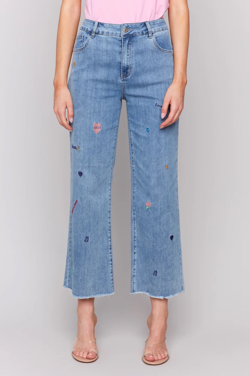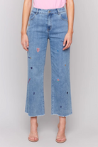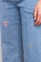 Step up your denim game for spring with these embroidered flare leg jeans in medium blue. The regular rise flatters your waist, while the flare leg keeps you on-trend. Pair with your favorite tops and step out in style!