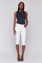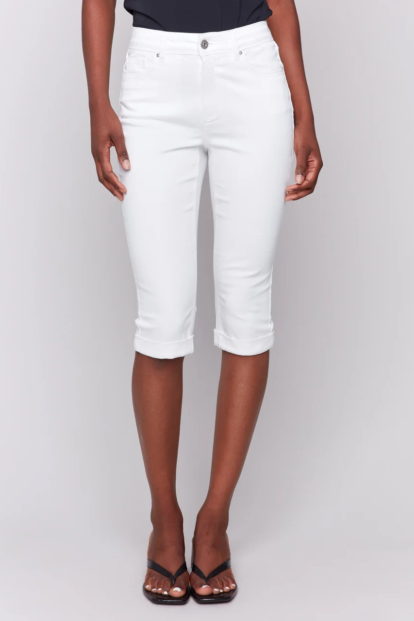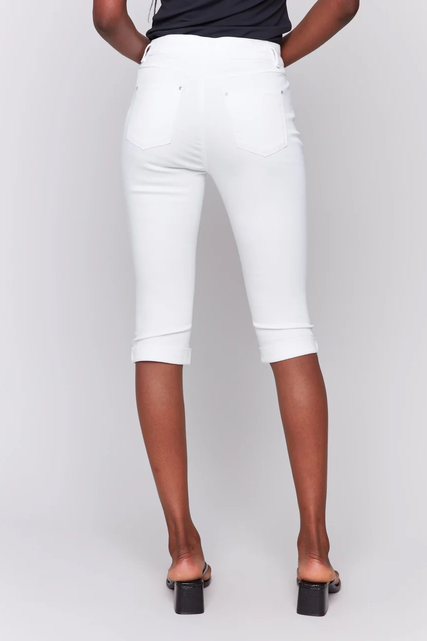 These crisp white pedal pusher pants add a playful touch to classic trousers. Designed in a stretchy twill fabric with a slim fit and folded hem, they offer a sleek and elegant style. A spring and summer wardrobe staple, perfect for casual strolls or relaxed weekends.