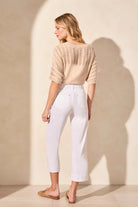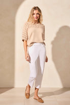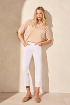 Greet sunny days in style with these pull-on capris rocking an elastic waist that sits smooth but stretches when needed. We love the decorative fly detail for added structure, functional belt loops, 5 pocket design with metal rivets, kick flare leg, 25" inseam, and soft twill fabric cut with a hint of spandex for all-day comfort.
