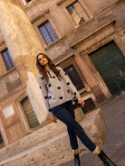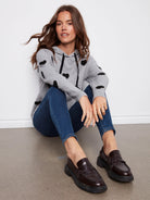 Settle into comfort this fall with the Heather Grey hoodie sweater. The embroidered hearts add a playful touch, and its relaxed fit with soft fabric makes it comfortable to wear all day. It's a great choice for layering in chilly weather or simply lounging around the house.