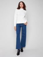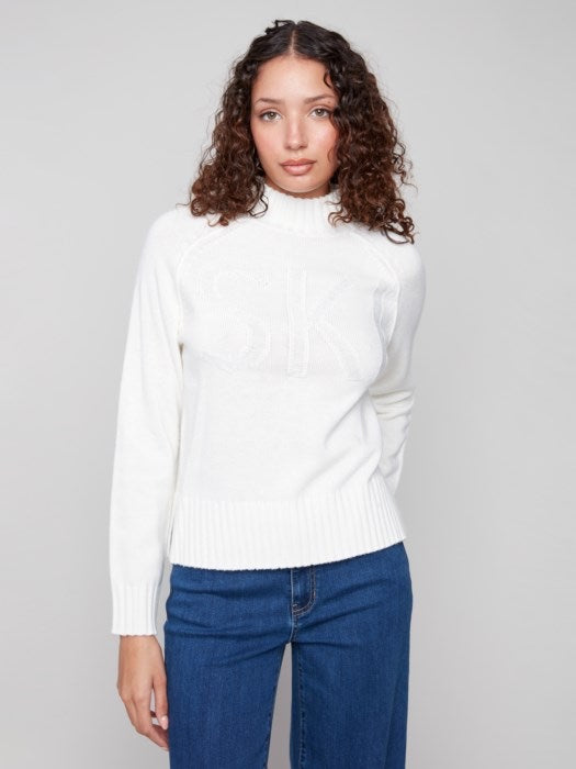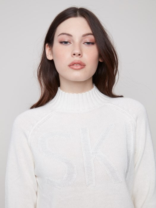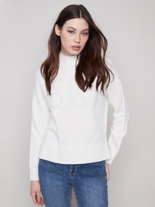 Placed Jacquard Mock Neck Sweater. Can you see the word SKI on the front and Star on the back? Adorable!