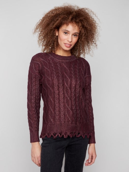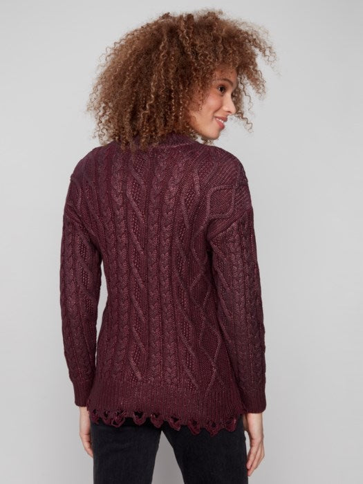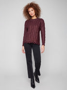 Shine bright with this Metallic Cable Knit Sweater in cabernet. Its elegant cable knit and metallic sheen create a luxurious look. This sweater is perfect for adding a touch of sophistication to any outfit, making it ideal for both casual and smart-casual settings. Wrap yourself in warmth and style with this versatile fall piece.