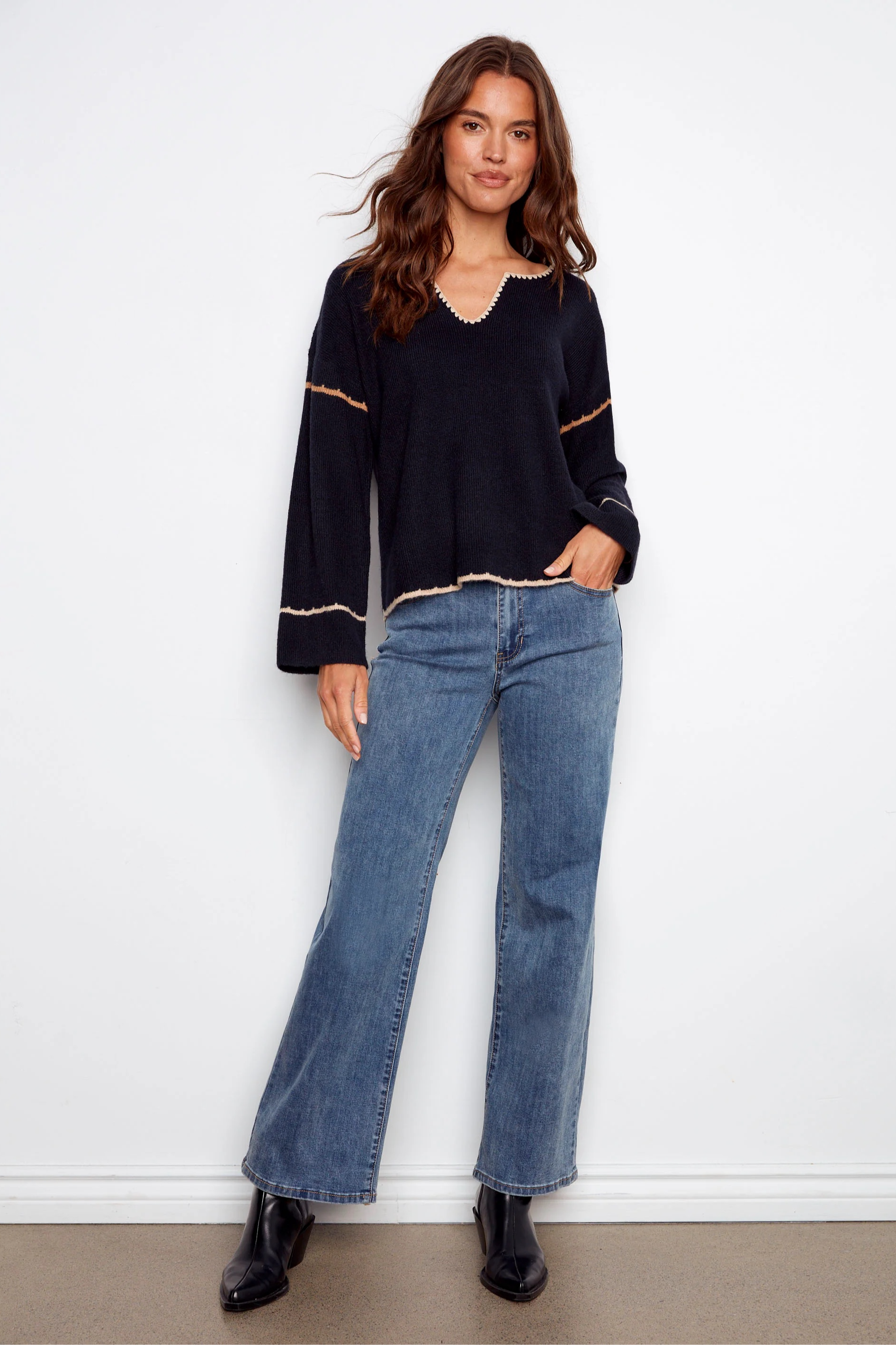 Show off your style this fall with this navy blue embroidered ribbed sweater featuring a notch neck. The beige back embroidery adds an elegant touch, while the drop shoulders and ribbed texture give it a modern edge. Its relaxed fit makes it perfect for casual outings or special occasions.