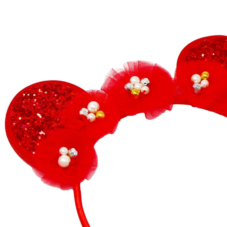 Complete your Claris outfit with the Limited-Edition Claris Ears Holiday Heist Headband. Decorated with glittery red Claris Ears, the easy and comfortable to wear headband is adorned with red tulle flowers embellished with Pearls & Beads on top of a Red ribbon-encased band.