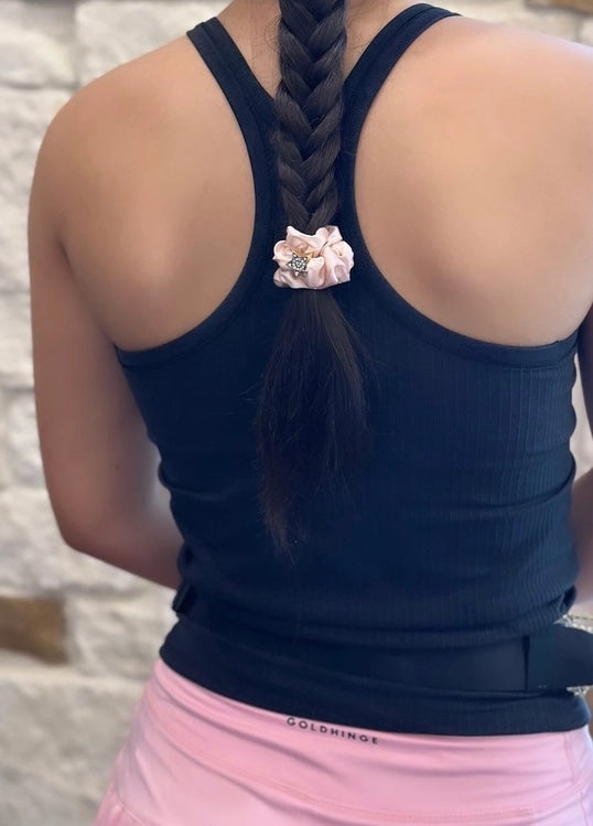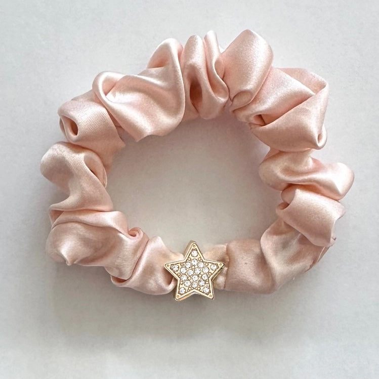 Luxurious light pastel pink real silk scrunchie adorned with our gold star charm.
