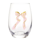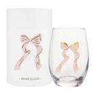 This luxurious stemless wine glass features a pink bow design with gold foil detail.
