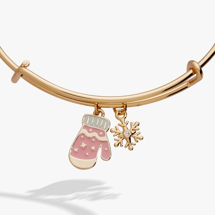 Embrace the magic of winter with this delightful Snow Games Mitten Duo Charm Bangle. This playful bracelet features two charm designs adorned with sparkling crystal details and signature logo stars that catch the light beautifully. The enamel-crafted snowflake charm adds a frosty finishing touch, perfect for celebrating the season in style. Whether you're hitting the slopes or cozying up by the fire, this expandable bangle brings a whimsical winter spirit to your everyday look. Mix and match with other Alex and Ani bracelets to create your own personalized stack.