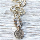This matte gold paperclip necklace features 6 sparkly clear crystals and a hand casted French Champagne coin token. Adjustable up to 20”