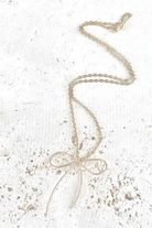 This lightweight necklace features a handmade bow pendant. The chain is a non tarnishing fine gold stainless steel. 18”