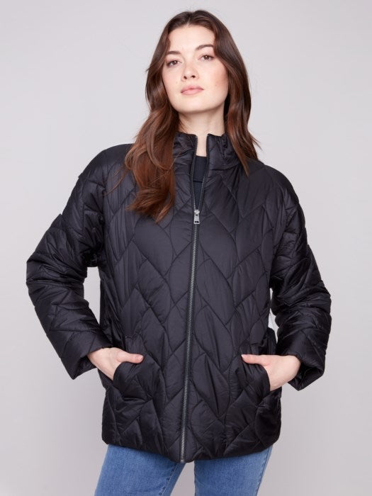 Drop Shoulder Quilted Puffer Jacket With Jacquard Back And Zip Front