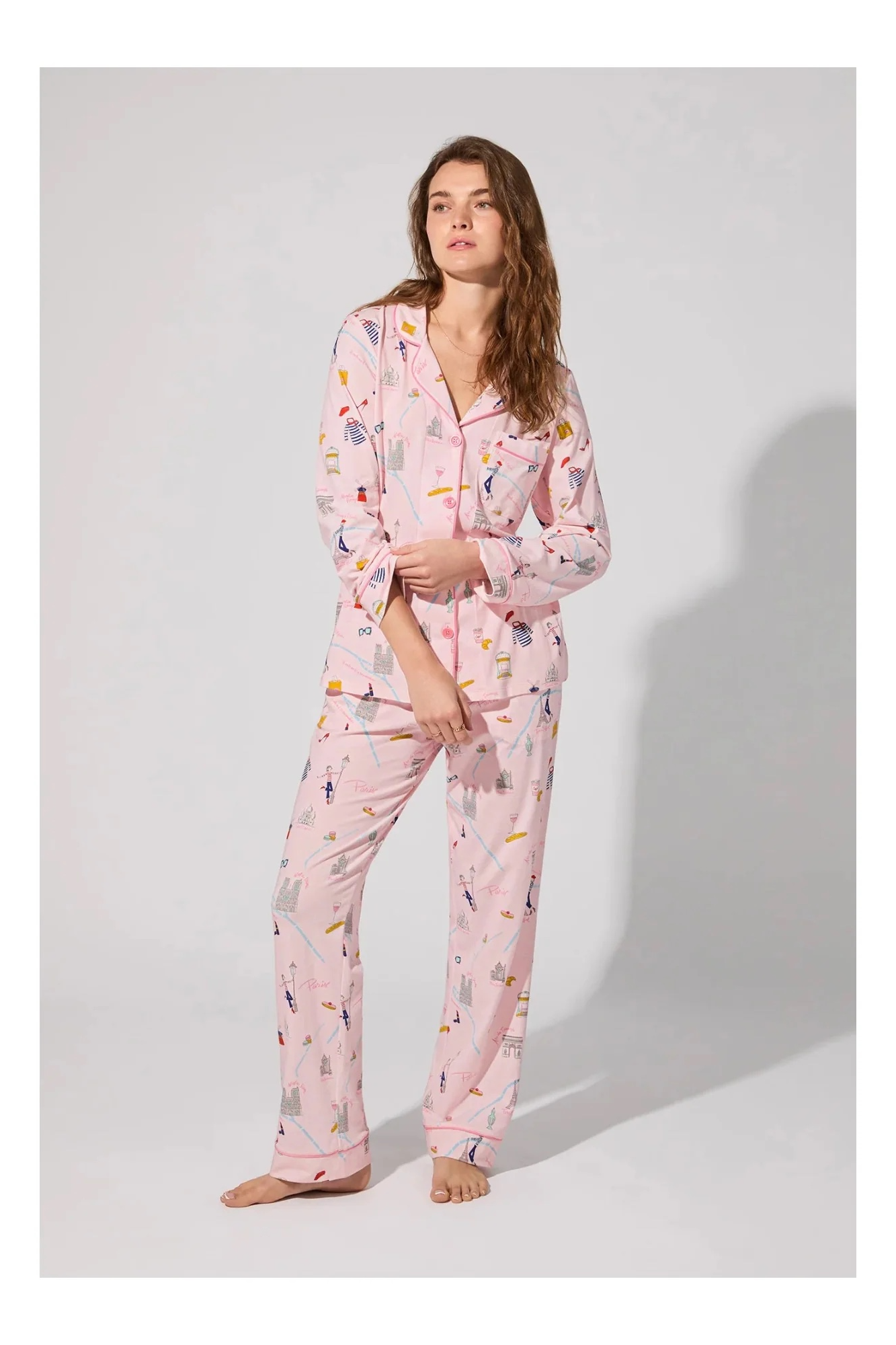 A two-piece long-sleeve pajama set printed in a playful Paris motif with a notched collar and button-front top. The 48 Hrs In Paris Pajama Set has relaxed-fit straight-leg pants for easy lounging. This bedtime favorite comes from Bedhead Pajamas and is made for cozy at-home comfort and weekend mornings.