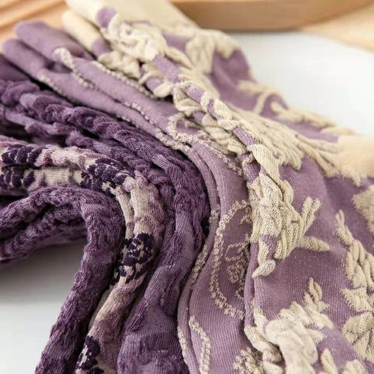 These socks feature an intricate embossed design in a lovely purple hue, adding a touch of bohemian flair to any outfit.