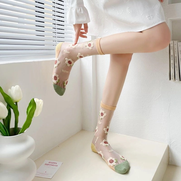 Charming Garden Party Motif: Adorned with a delightful floral pattern, these sheer socks capture the essence of a summer garden party, blending cute and fashionable elements for a standout addition to any outfit.