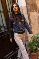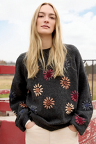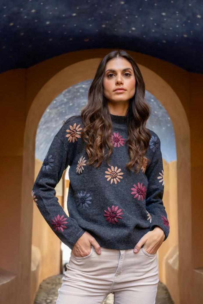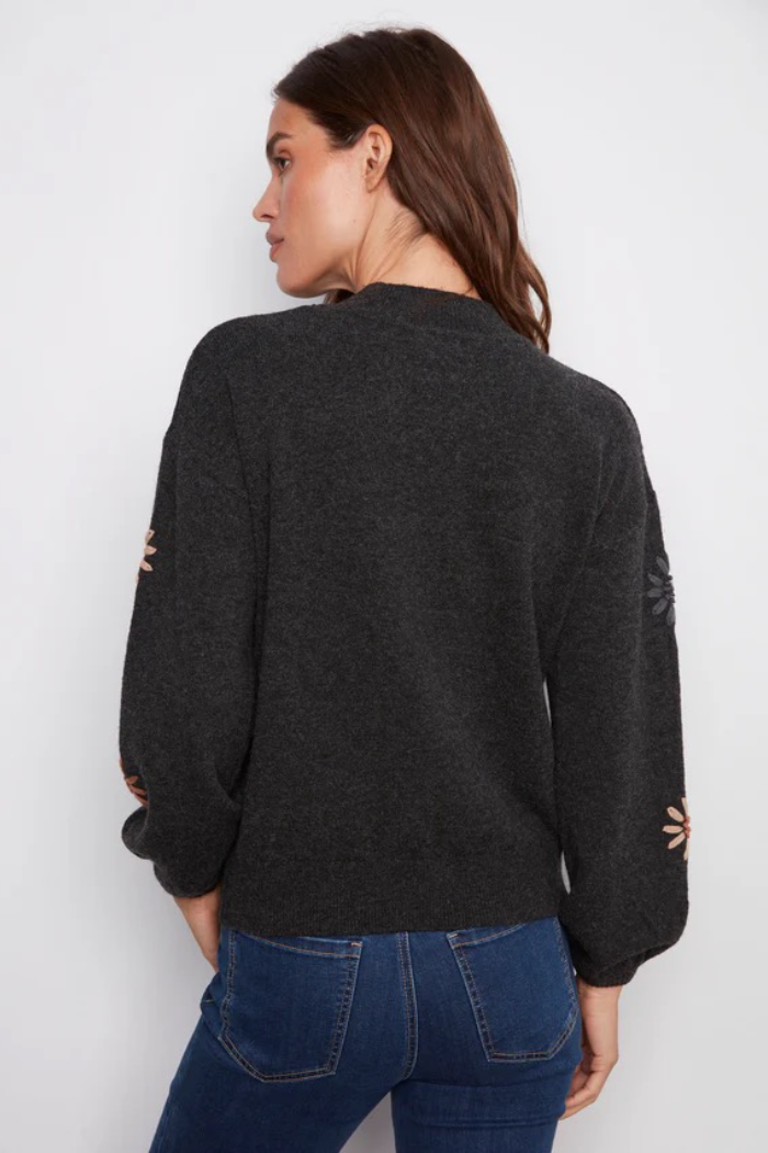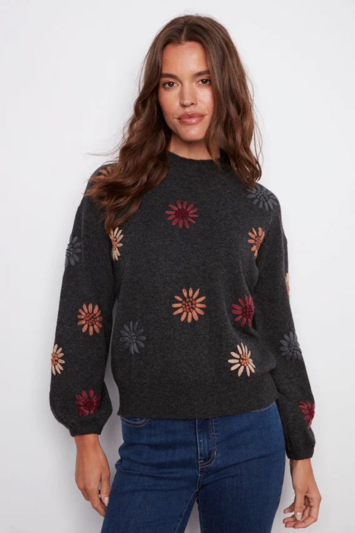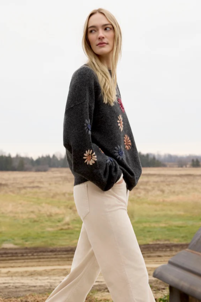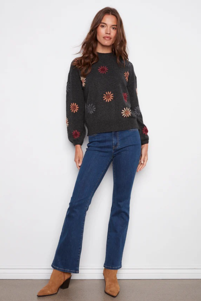 This heather charcoal gray sweater is a perfect addition to any fall wardrobe. The beautiful floral embroidery and mock neck provide a timeless yet contemporary look. Long sleeves with elastic cuffs add a subtle touch of sophistication. Perfect for layering or wearing on its own, it’s destined to become a favorite go-to piece.