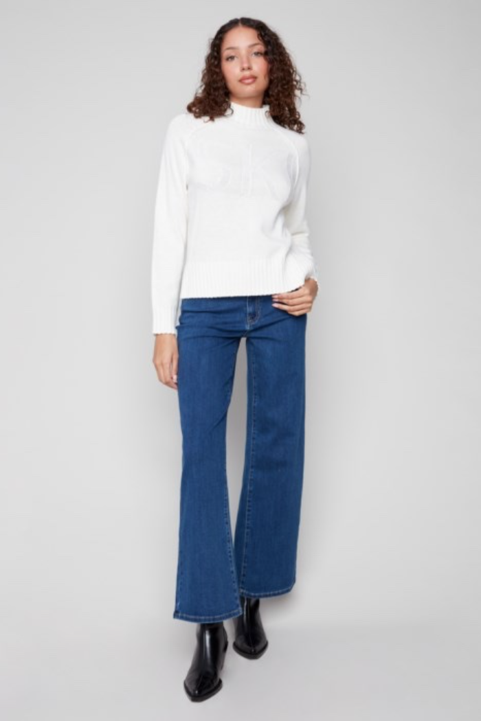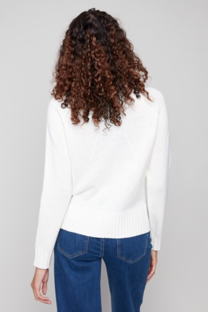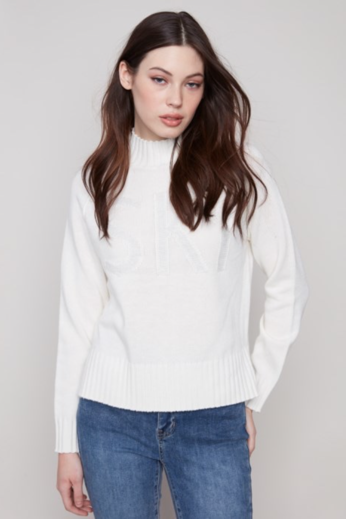 Placed Jacquard Mock Neck Sweater. Can you see the word SKI on the front and Star on the back? Adorable!
