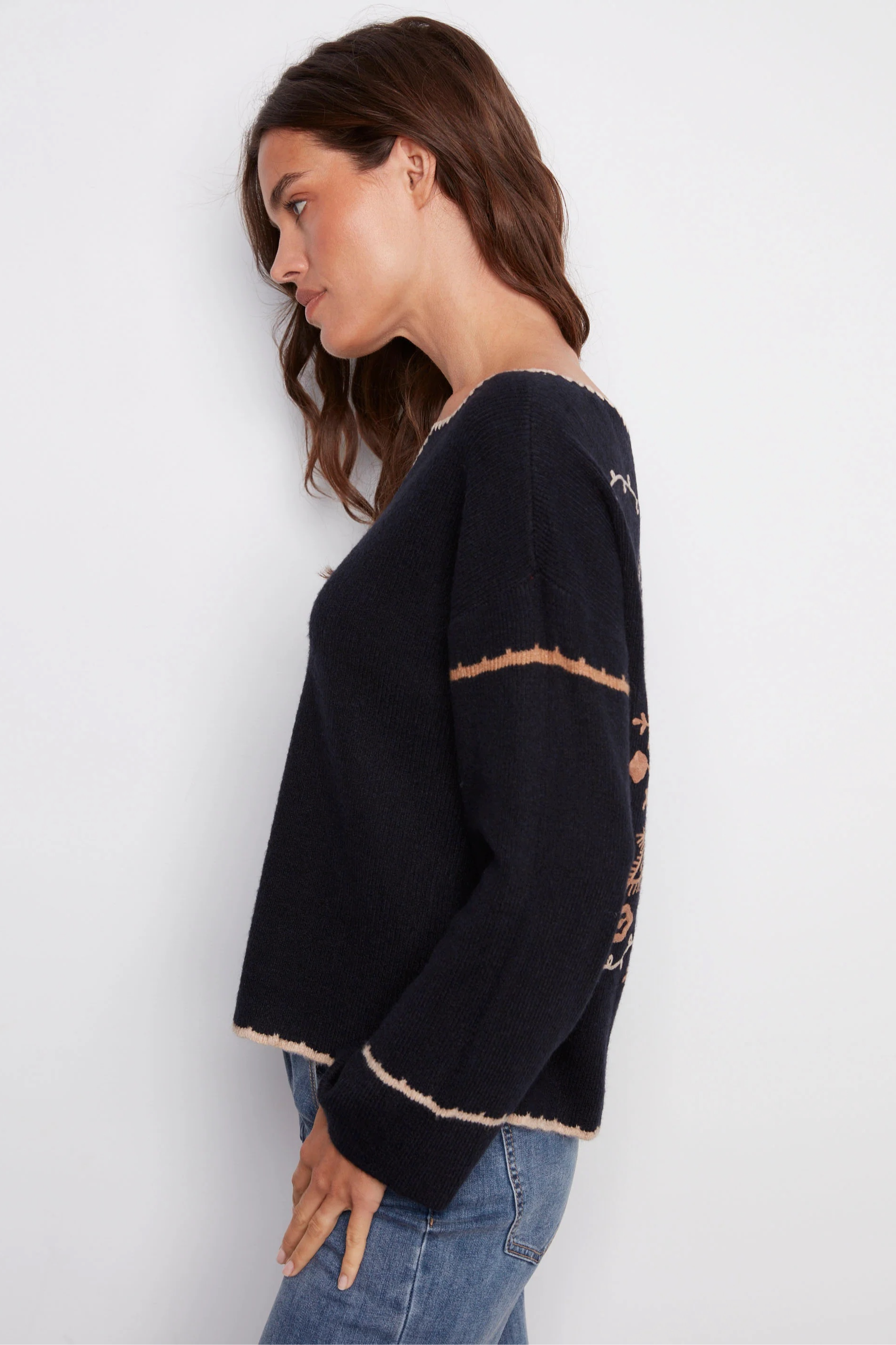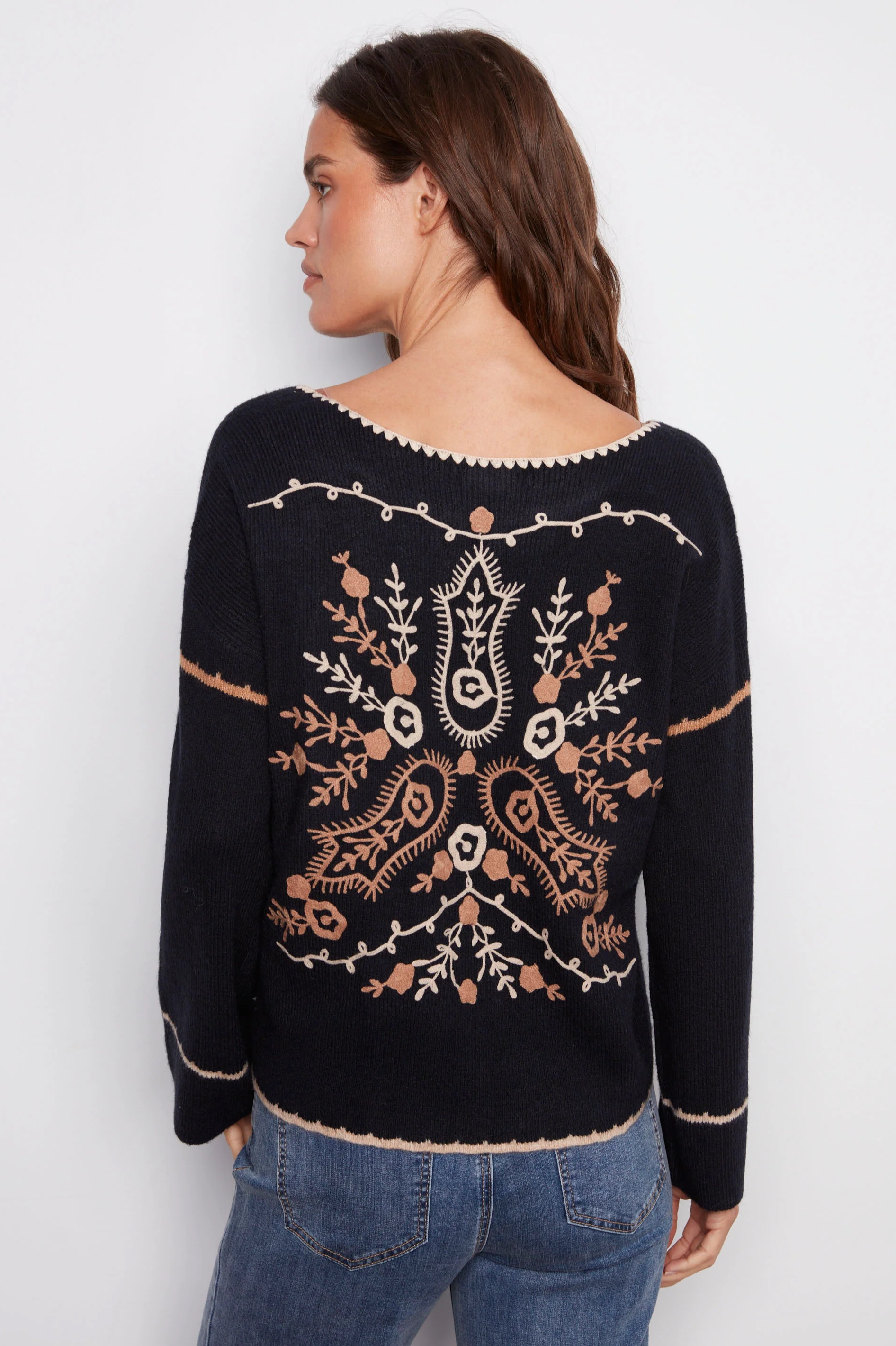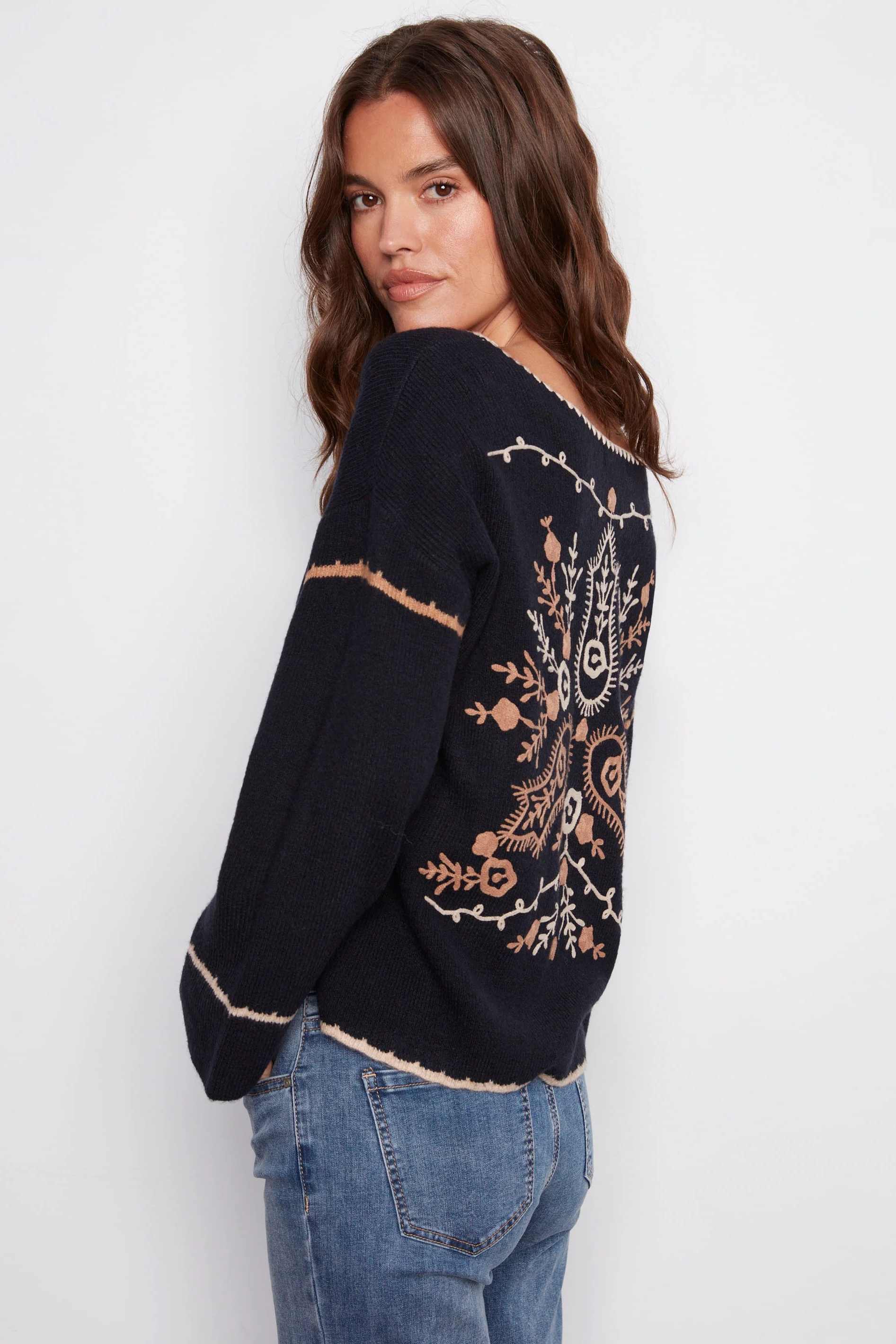 Show off your style this fall with this navy blue embroidered ribbed sweater featuring a notch neck. The beige back embroidery adds an elegant touch, while the drop shoulders and ribbed texture give it a modern edge. Its relaxed fit makes it perfect for casual outings or special occasions.