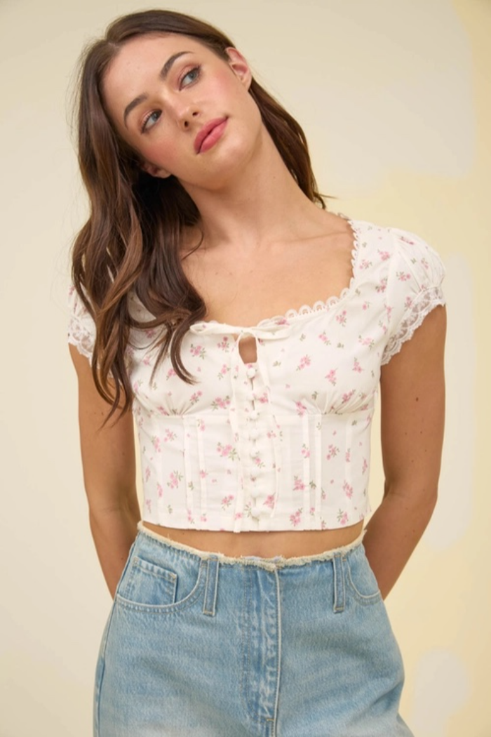 This top could be styled in various ways, like pairing it with high-waisted jeans, skirts, or shorts for a fun, casual look or dressing it up with a skirt and accessories for a more polished outfit.