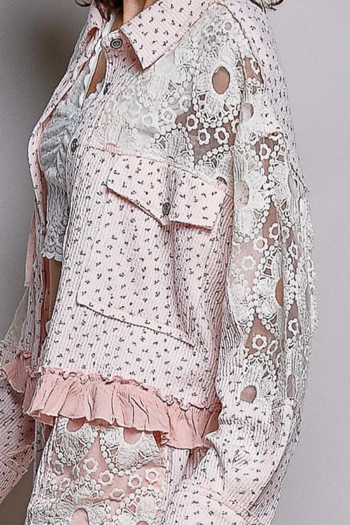 A delicate lace-patched jacket/top with mixed-texture panels and a relaxed, slightly boxy silhouette. The Lace Patch Jacket/Top pairs sheer lace inserts with a lightweight woven body and a classic shirt collar for a feminine layering piece. POL designed this piece with long sleeves and button-front styling that reads casual yet thoughtfully detailed. Wear it over a bralette or tee for an elevated everyday look.