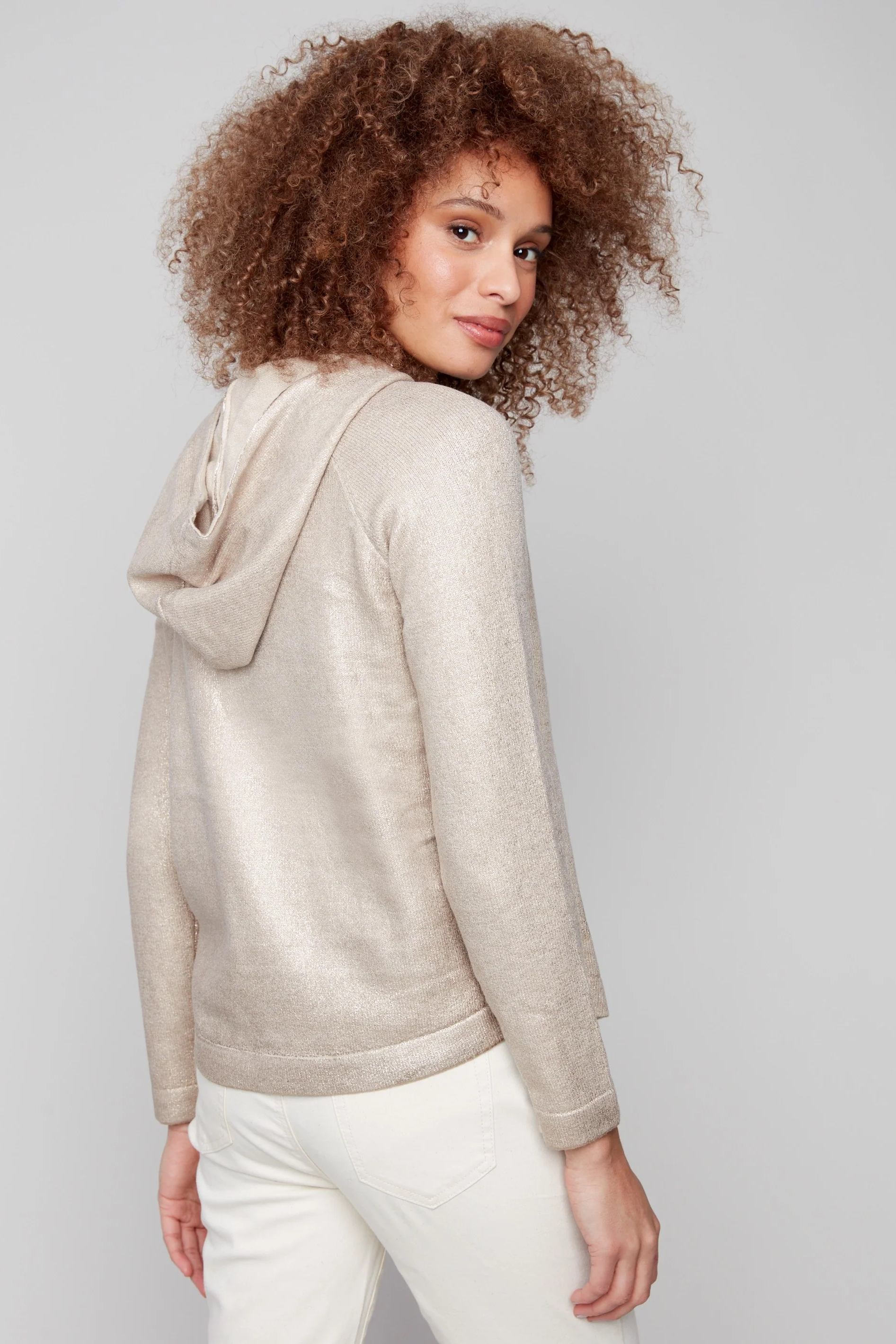 Effortlessly shine this fall with this Metallic Knit Hoodie Sweater in a beautiful champagne beige color. Its soft texture and gentle shimmer make it a standout top in any wardrobe. Ideal for bringing elegance to your everyday look, its long sleeves and adjustable hood offer both comfort and style.