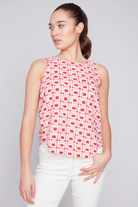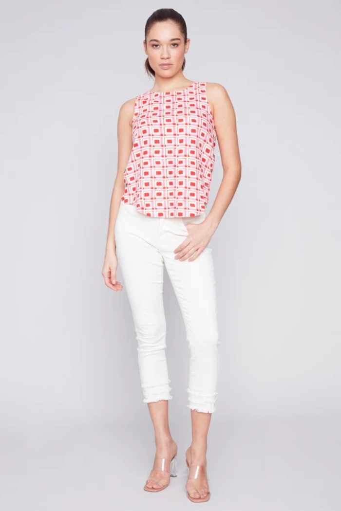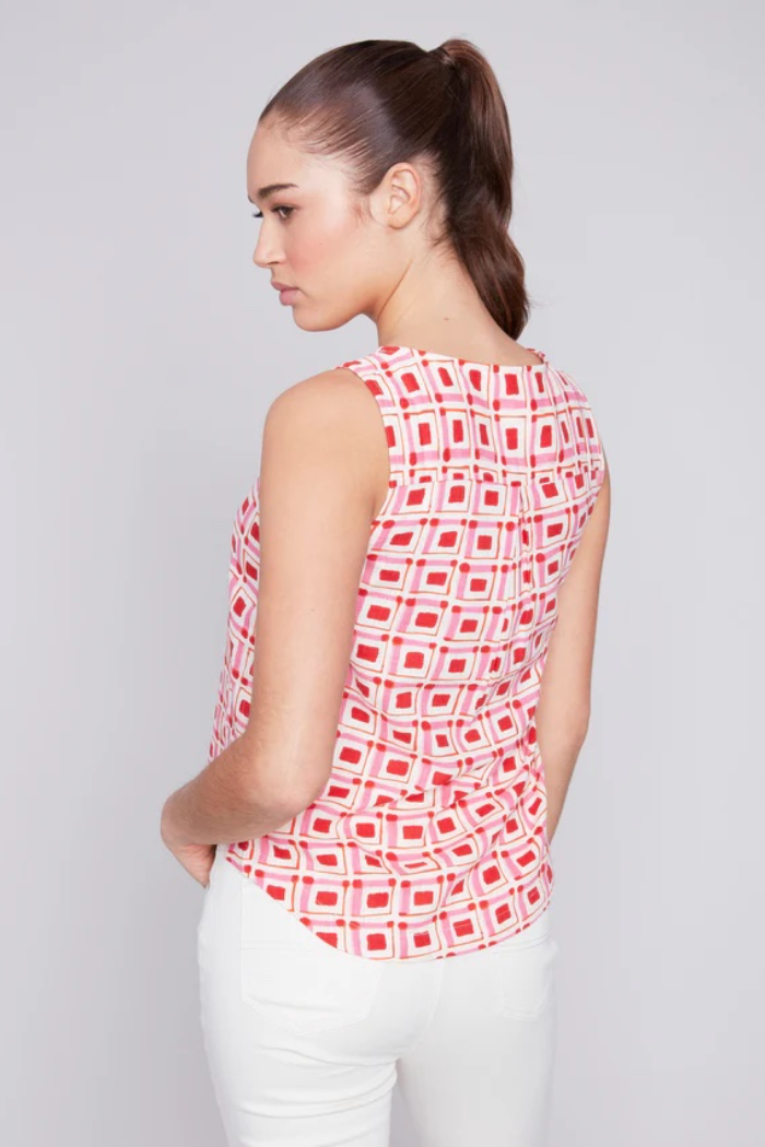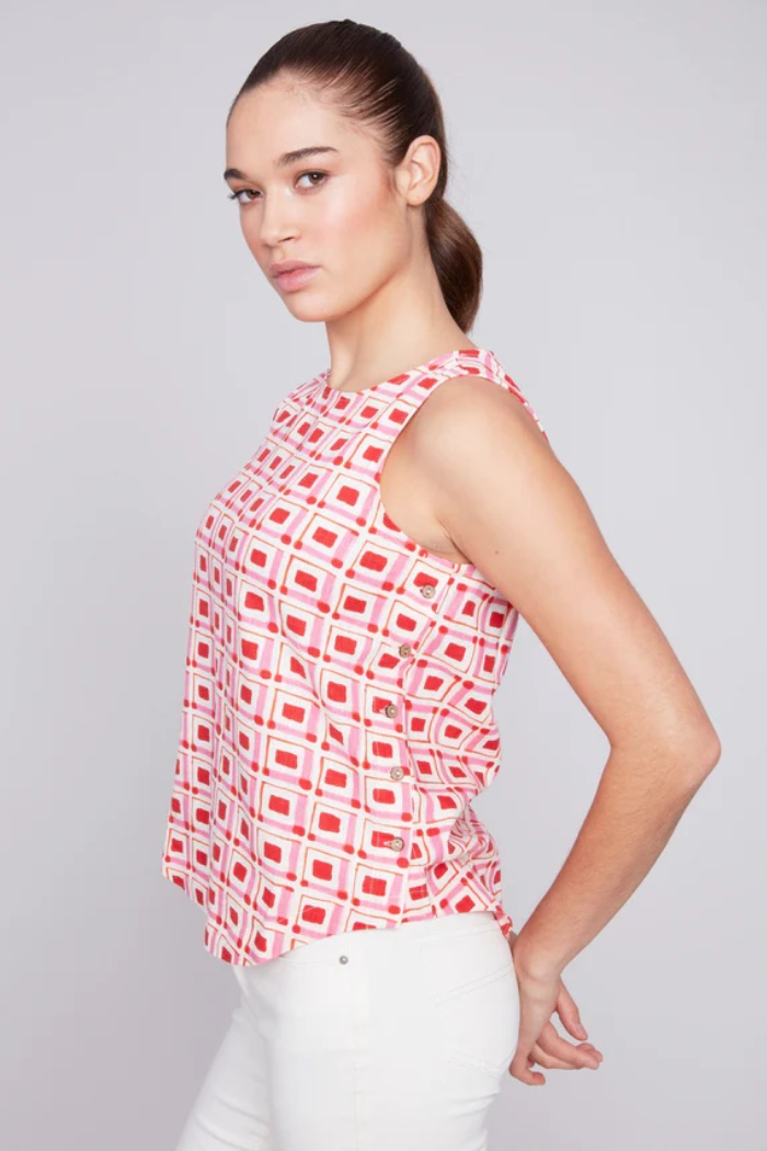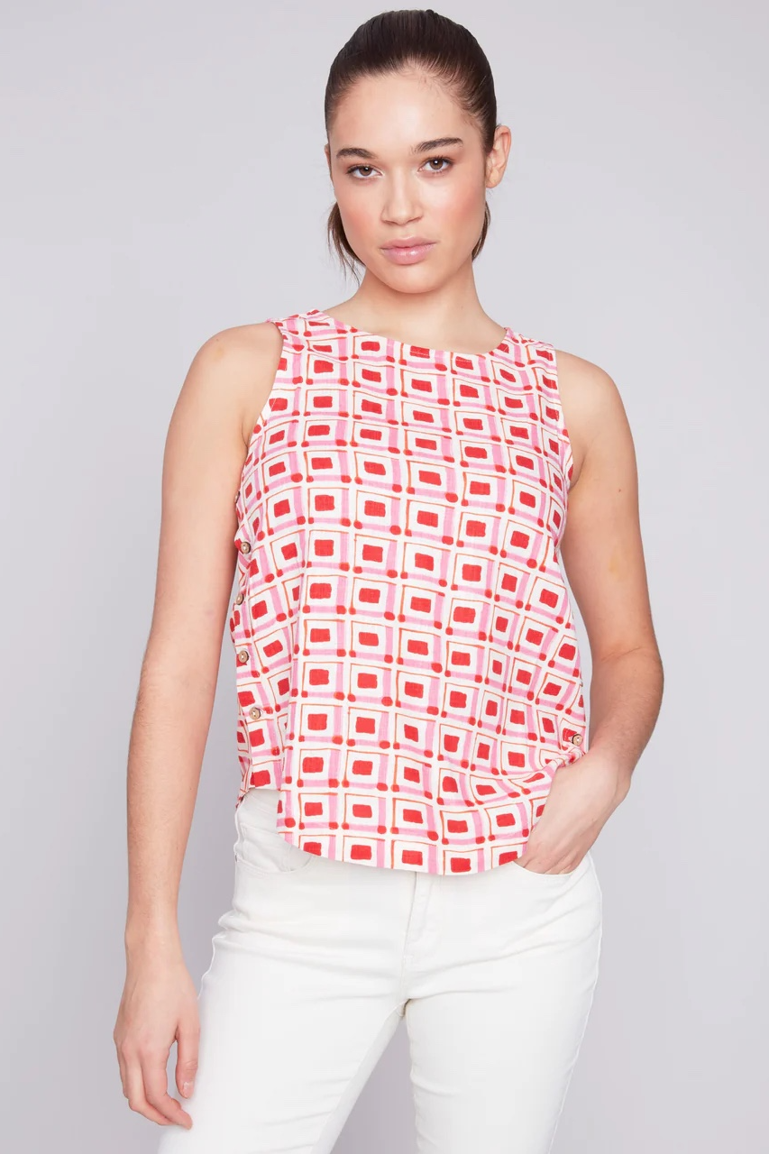 Pull on this light and flowy tank top for women for serious comfort and style this season. Featuring a fashionable print, side button detail, rounded hem and crew neckline, it’s a must-have summer top that pairs perfectly with your cropped pants or skorts. Order yours in Cherry now.
