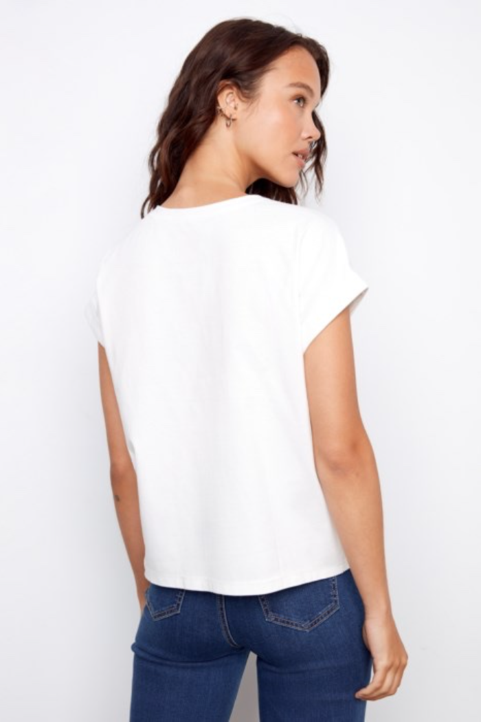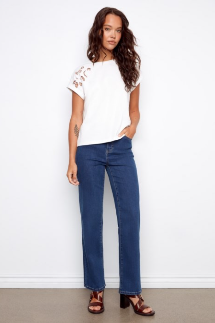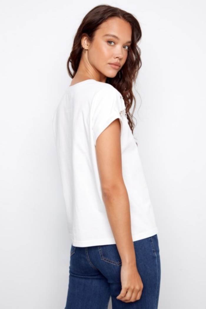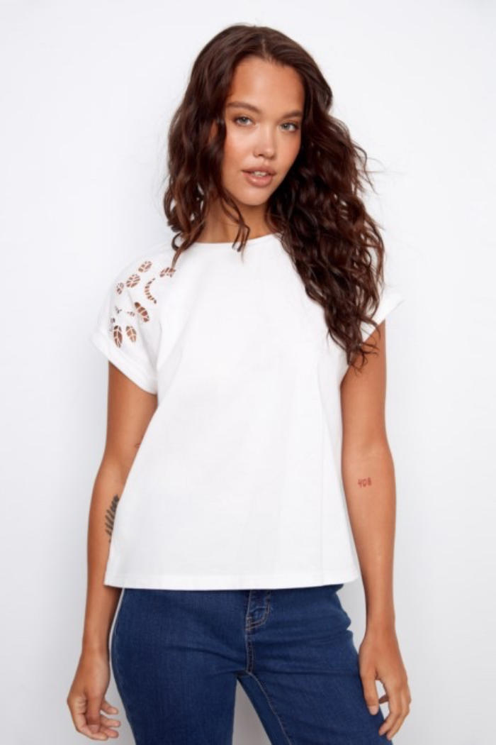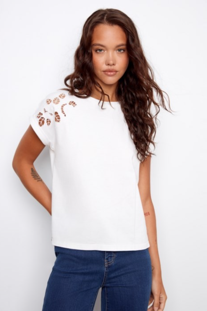 The T-Shirt with Embroidery is a relaxed, short-sleeve tee detailed with delicate shoulder embroidery for a subtle, elevated look. It has a classic crew neckline and a boxy silhouette that layers easily or stands alone with denim. Lightweight fabric and cuffed sleeves keep the feel casual and wearable for everyday styling. This piece is from Charlie B and brings handcrafted detail to a wardrobe basic.