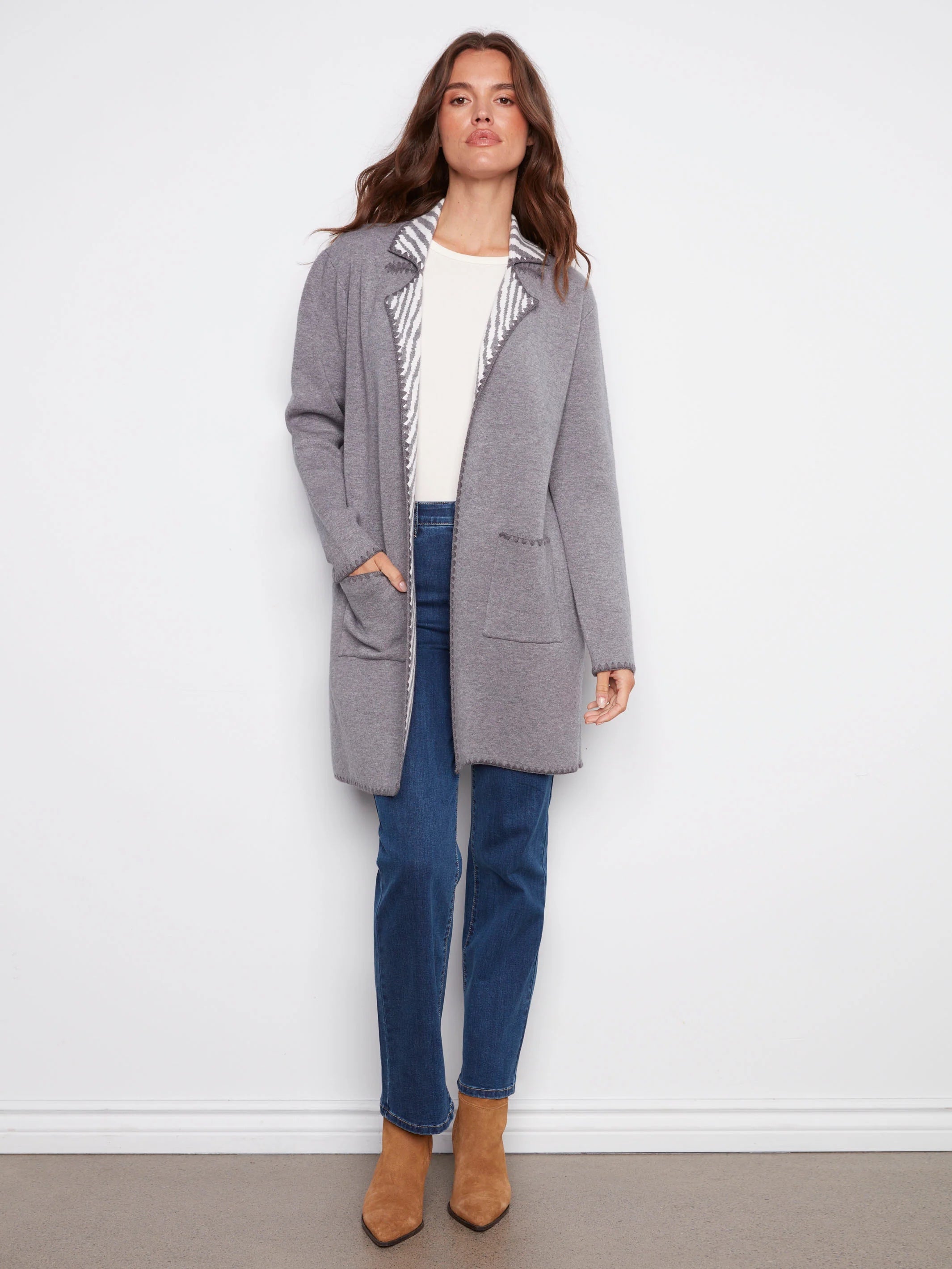 The Heather Grey Long Cardigan brings cozy sophistication to your fall wardrobe. Crafted from a soft, luxurious fabric blend, it features a chic zebra-striped lining and elegant blanket-stitch detailing. Front patch pockets add practicality without compromising style, making this cardigan the perfect companion for casual days or relaxed evening outings.