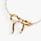 This pearl-studded bolo bracelet is your ticket to effortless elegance with a playful twist. Delicate white pearls cascade along a rosary chain, anchored by a radiant gold-plated bow crowned with a brilliant crystal centerpiece. The adjustable bolo closure adapts to your wrist, while the intricate detailing gives it that luxe, fine jewelry vibe. Whether you're stacking it with other favorites or letting it shine solo, this versatile beauty glides seamlessly from brunch to evening—proof that sometimes the sweetest accessories pack the most style.