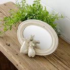 This charming tabletop mirror features three peeking bunny figures clustered at the base of an oval, distressed-frame glass. The Bunnies Peeking Mirror has a vintage-inspired, shabby-chic finish with subtle paint distressing and scalloped inner trim. This mirror adds a whimsical, cottage-style accent to a dresser, entry table, or nursery.