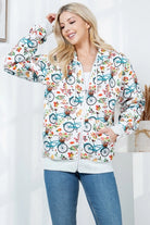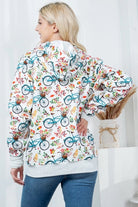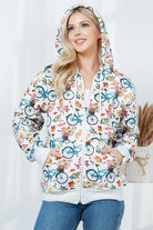 This Floral Bicycles Zipper Hoodie is a zip-front, hooded sweatshirt printed with whimsical bikes and florals for an easygoing look. The lightweight knit and relaxed silhouette make it perfect for layering on cooler days. LA Soul designed it with a drawstring hood and cozy cuffs for comfortable, casual wear.