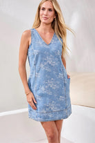 A breezy denim shift with an allover hydrangea print, perfect for sunny days and easy weekends. The Hydrangea Print Denim Dress from Tribal features a sleeveless V-neck silhouette and a relaxed mid-thigh length. Lightweight denim and subtle floral detailing give it a casual, modern vibe ideal for vacation or everyday wear.