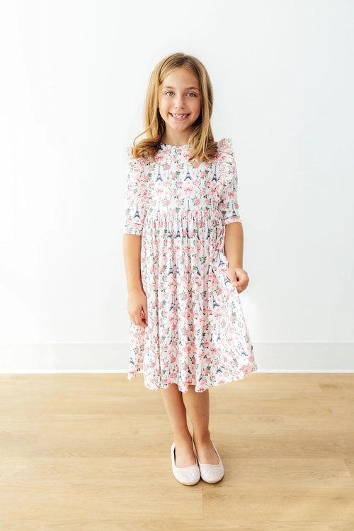 A twirl-ready girls' dress with a full gathered skirt and playful Paris-inspired print. The Mila in Paris Twirl Dress features a fitted bodice, elbow-length sleeves, and lightweight woven fabric for easy movement. Designed by Mila & Rose, it’s perfect for parties, photos, or everyday fanciful play.