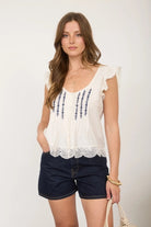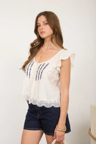 A breezy pintuck button down top with delicate embroidered panels and a scalloped lace hem. The Pintuck Button Down Top is cut from lightweight, gauzy fabric and features a scoop neckline with flutter cap details. Pair it with denim or warm-weather shorts for a relaxed, vacation-ready look.