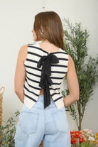 A breezy striped knit with a tie-back detail that updates a classic silhouette. The Stripe Back Tie Sweater features a crew neckline and sleeveless cut for a warm-weather layered look. This sweater is designed in a lightweight ribbed knit with horizontal black and white stripes for effortless, preppy-chic styling. Pair it with high-waisted denim or tailored shorts for casual weekend outings.