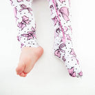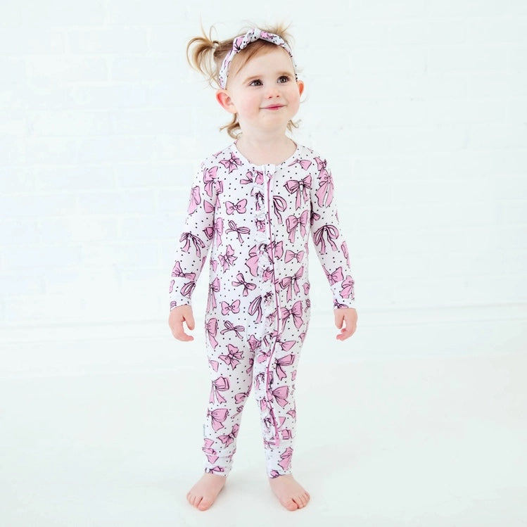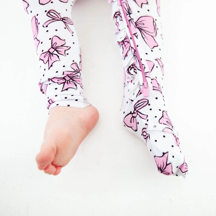 Covered in adorable pink bows and black dots, this may be the sweetest and girliest print there ever was! Whether you prefer a footie or romper, this all-in-one convertible piece does it all! Made with two way zippers for easy diaper changes, this adorable romper features fold over cuffs on the ankle which converts this romper to a footie as desired. This piece is designed to last twice as long as the average footie, due to the extra length and super stretchy fabric.