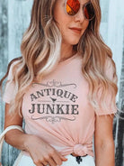 The Antique Junkie Graphic Shirt is a faded, vintage-style tee with the words "Antique Junkie" printed across the chest in a bold, distressed font. The shirt has a well-worn look, as if it's been discovered at a flea market or antique store. It's perfect for anyone who loves vintage finds and the thrill of the hunt.