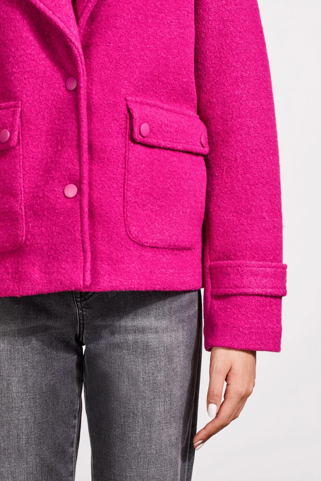 Maintain your eye-catching elegant style while staying cozy with this boiled wool peacoat. Featuring a chic notch collar and a streamlined snap-up front, it exudes sophistication. With a 24" length and long sleeves adorned with decorative wrist tabs, it's both stylish and functional. Stay organized with side pockets and flap-top patch pockets at the hip, complete with snap closures for added convenience.