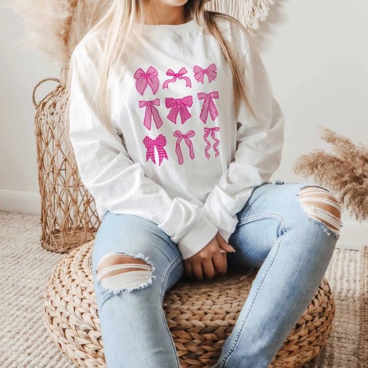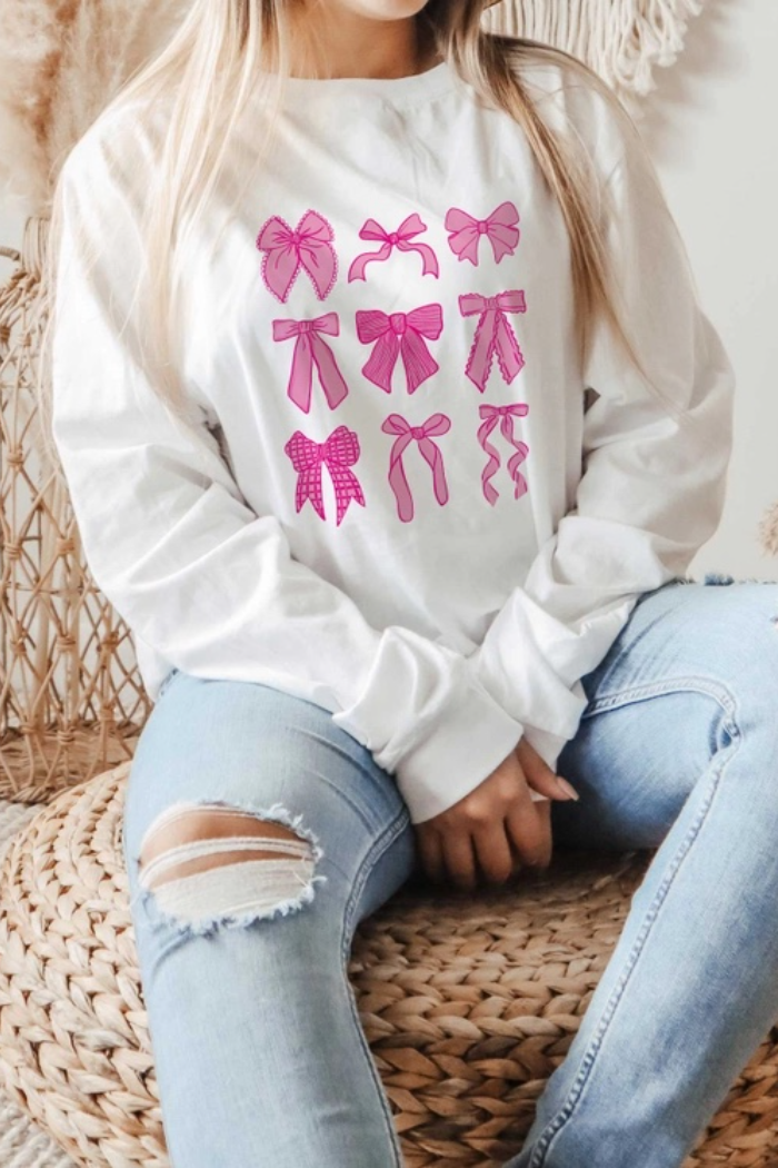 Whether you're dressing up for a casual day out or comfy at home. You can't go wrong with a pink bow long sleeve tee.