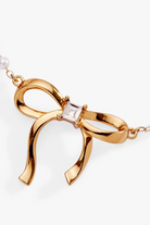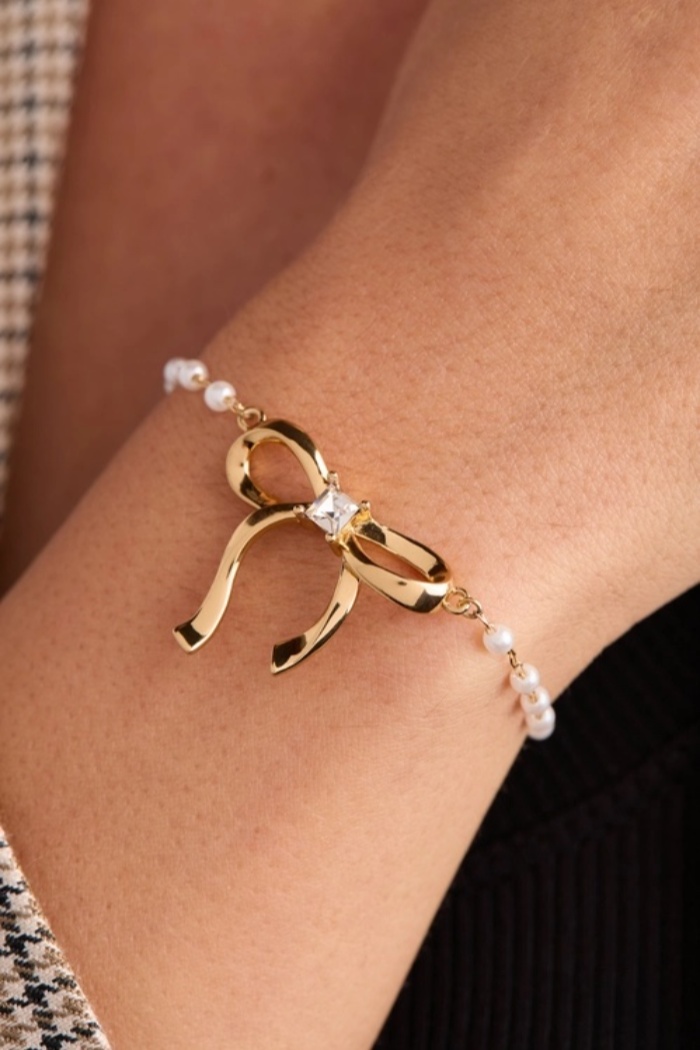 This pearl-studded bolo bracelet is your ticket to effortless elegance with a playful twist. Delicate white pearls cascade along a rosary chain, anchored by a radiant gold-plated bow crowned with a brilliant crystal centerpiece. The adjustable bolo closure adapts to your wrist, while the intricate detailing gives it that luxe, fine jewelry vibe. Whether you're stacking it with other favorites or letting it shine solo, this versatile beauty glides seamlessly from brunch to evening—proof that sometimes the sweetest accessories pack the most style.