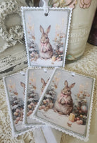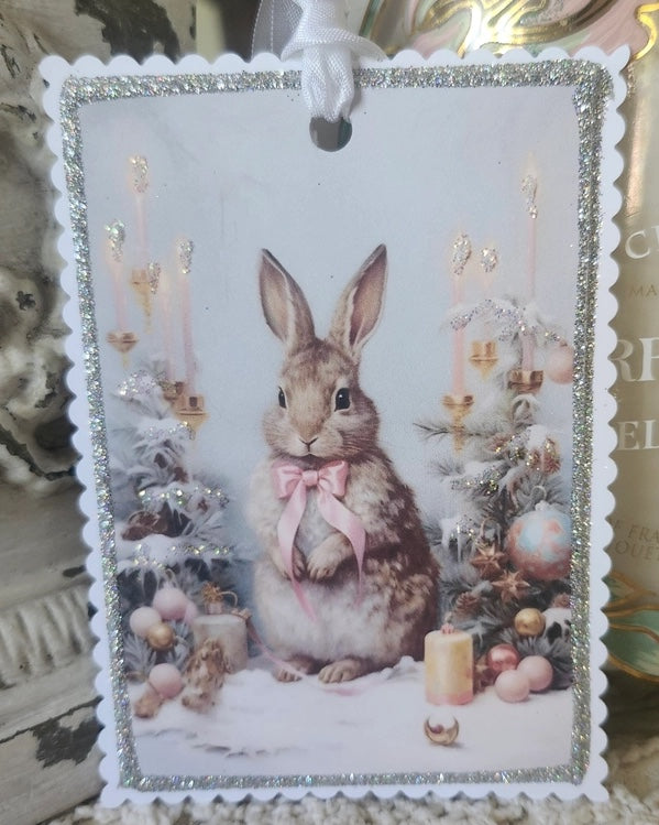 A charming holiday gift tag illustrated with a vintage-style bunny surrounded by festive ornaments and candles. The Christmas Bunny Gift Tag adds a delicate, nostalgic touch to wrapped presents and holiday favors. Little Hearts Designs crafts this decorative paper tag with scalloped edges, silver glitter trim, and a ribbon loop for easy attachment. It's perfect for dressing up gifts with a whimsical, cottage-inspired aesthetic.