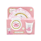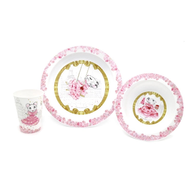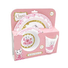 This 3 piece dinner set is BPA free and features floral patterns and character illustrations. Included in the set is a plate, bowl and tumbler, all presented in a window front display box.