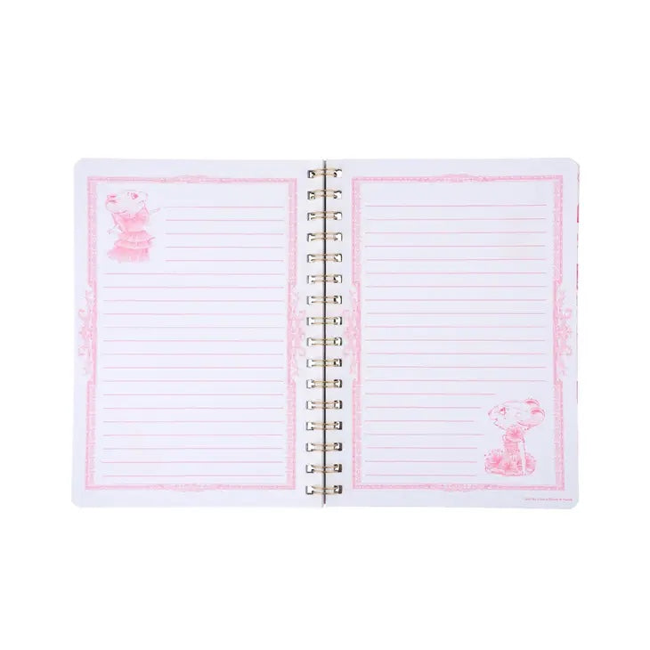 Notebook with gold wire spiral binding featuring double-sided cover design, gold foil detailing, patterned lining and pink lined pages.