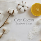 Clean Cotton is a crisp scent of freshly cleaned linens, highlighted with a kiss of sweet citrus and a slightly woody bottom note.