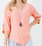 The Dorie flatters and stuns on everyone! The v-neckline and matching v-pointed bottom (front and back) make for a slimming look, topped off with cuffed sleeves secured with buttons.