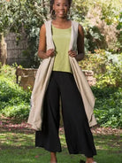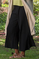 The Esme is a wide leg pant featuring knee high slits on both legs that can be left open or tied on the bottom, WITH POCKETS!