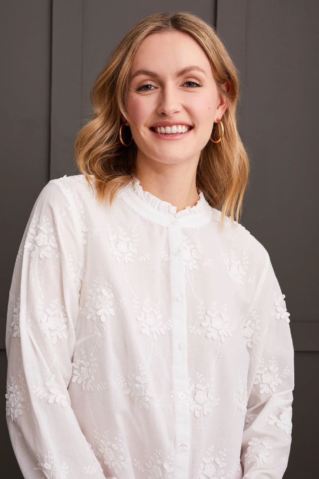 Elevate your style with this blouse, crafted from cotton poplin fabric adorned with charming all-over floral embroidery for a playful, textured look. The button-up design is accentuated by a short ruffled collar, while long sleeves with elastic openings offer a touch of flair. A lightly gathered detail at the back yoke provides both shape and flexibility, ensuring a flattering fit that moves with you.