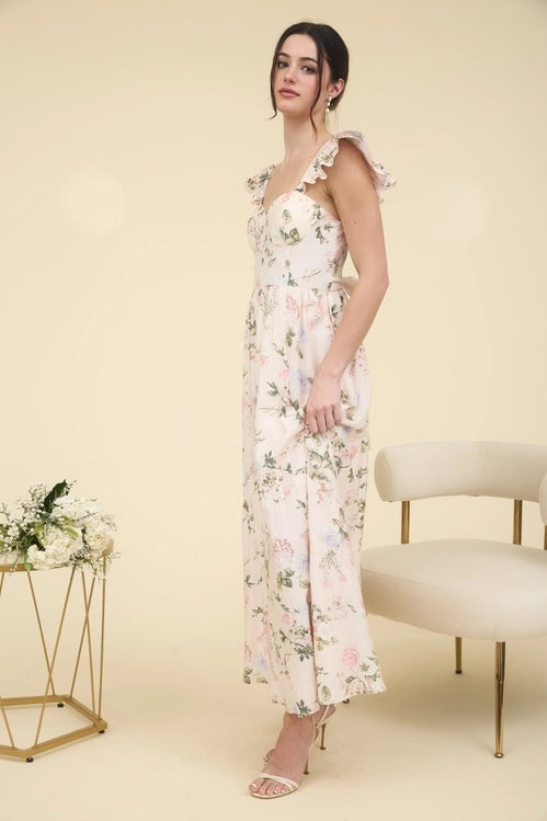 A flowing maxi dress with a vibrant floral pattern, featuring a sweetheart neckline and corset detailing that cinches the waist. Ruffled straps add a whimsical touch, while a back tie strap allows for a perfect fit. It's a dress that's perfect for a summer wedding, a garden party, or any occasion where you want to feel beautiful and feminine.